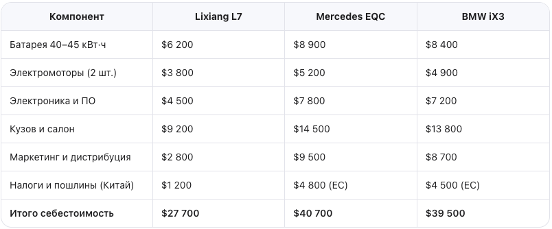 Низкая цена Lixiang L7 в Китае — результат эффективной локализации, прямой модели продаж и государственной поддержки, а не снижения качества. При вывозе из Китая экономия частично нивелируется логистикой и таможней, но остаётся на уровне 10–15% против европейских аналогов. Для белорусского покупателя ключевой вопрос — не цена сама по себе, а наличие сервисной поддержки и доступности запчастей, где европейские бренды пока сохраняют преимущество.